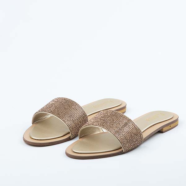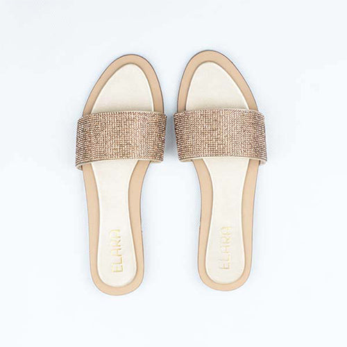 Shine with understated glamour in these chic slip-on flats. Crafted with a shimmering bronze-toned strap embellished with fine beadwork, these sandals add instant sophistication to any outfit. The soft cushioned sole ensures comfort, while the minimal design makes them versatile for both day and evening wear. Perfect for festive occasions, parties, or simply elevating your everyday style.